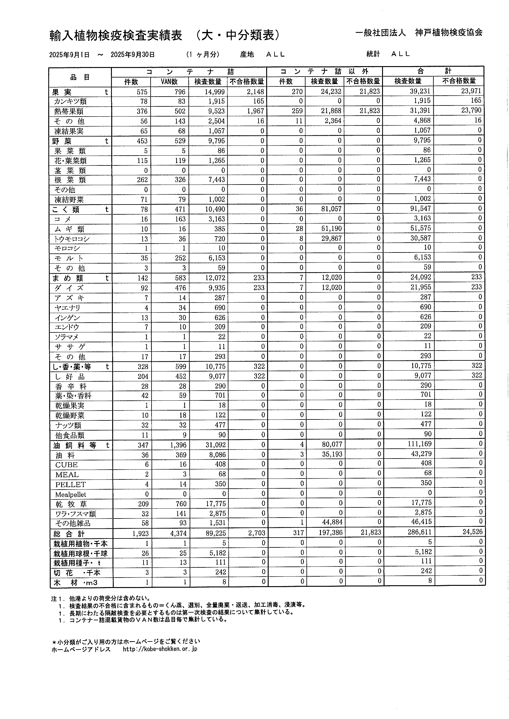 1ヶ月間の神戸港における輸入植物の分類別統計です。